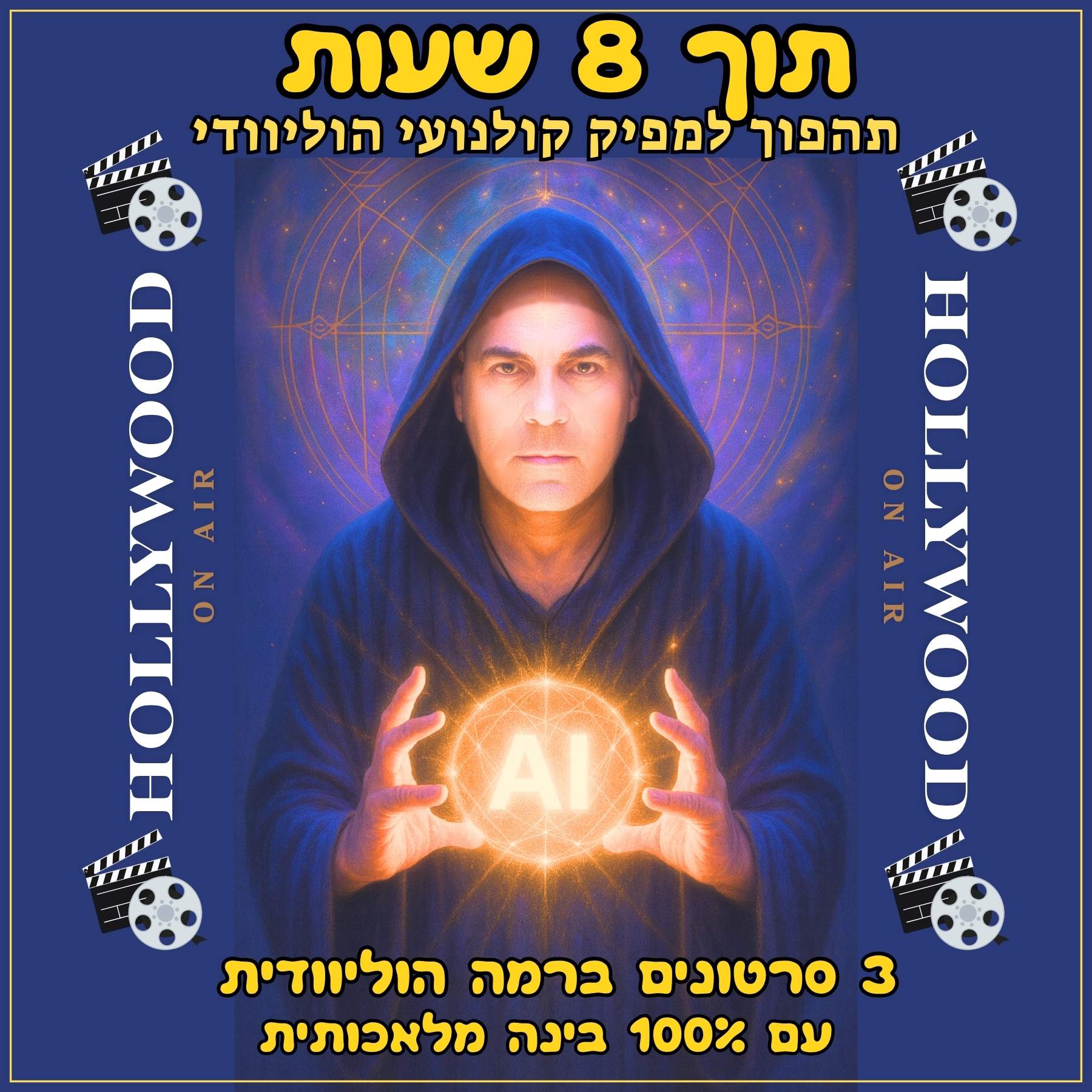 באמצעות כלים חכמים של בינה מלאכותית ועריכה מתקדמת, תוך 8 שעות בלבד – יש לך 3 סרטוני וידאו הוליוודיים משלך.”